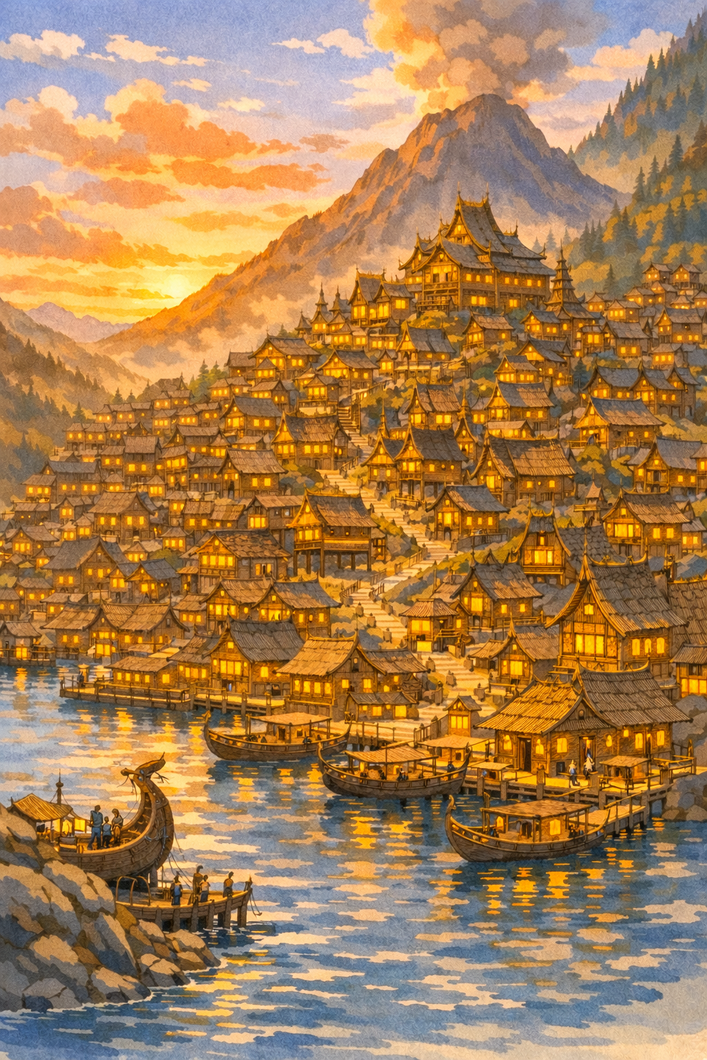Die Sonne senkte sich langsam hinter den Mount Dalar und tauchte die Stadt in ein warmes, rötliches Licht. Elanor schimmerte wie aus Gold – fast vollständig aus Holz erbaut, mit langen, hohen Häusern, bunt gedeckten Dächern, Wachtürmen und kleinen Kirchen, die sich dazwischen erhoben. Ganz oben thronte das Langhaus des Jarls, des Herrschers der Insel.