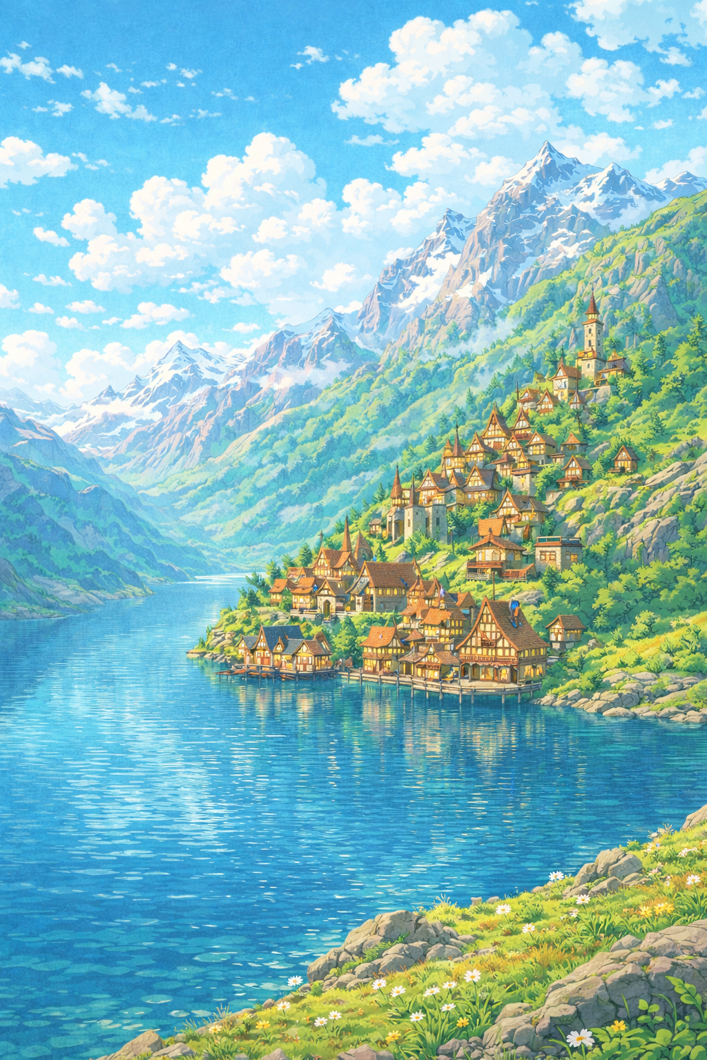 Die Reiterin schauderte, als ihr Blick zu den verschneiten Gipfeln schweifte deren weisse Häupter von tief hängenden Wolken verhüllt waren. Die hellgrauen Felswände bildeten einen scharfen Kontrast zum goldgelben Gras, das der Wind flach an den Boden drückte. Hoch oben am Fusse des Mont Caldrill – des höchsten Berges des Königreichs – lag Alt Hagen, ihr Ziel: die Bergstadt, halb in Stein gemeisselt, halb in den See hinausgebaut. Hinter einer Kuppe tauchten weit in der Ferne die ersten Gebäude auf, klein und steinern, am Hang verstreut. Dann kam der See in Sicht – ein klarer, stiller Spiegel, so durchsichtig, dass man bis auf den Grund sehen konnte. Weit hinten, am Fusse des gewaltigen Felsmassivs, schmiegte sich Alt Hagen an den Berghang: verschachtelt, farbenfroh, in der typischen Architektur der Zwerge – mit hohen, engen Giebeln, Fachwerk, Balkonen und Erkern organisch verwachsen am Berghang. Der vordere Teil der Stadt ragte auf Holzpfählen weit in den See hinaus. Kleine hölzerne Türme mit spitzen Dächern und flatternden Bannern verliehen dem Anblick eine fast freundliche Idylle