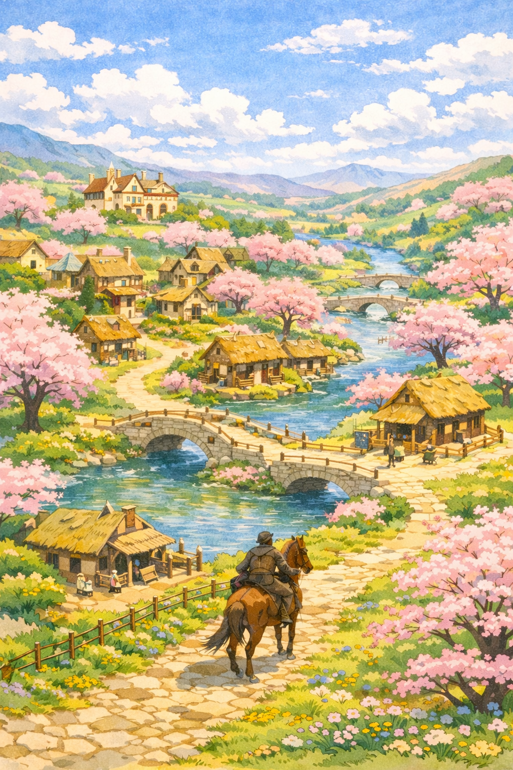Der gepflasterte Weg zum Dorf führte über mehrere steinerne Brücken, die elegant die verzweigten Arme des Flusses überspannten. Kleine Wassermühlen mit Strohdächern säumten die Kanäle, die vom Hauptstrom abzweigten. Die rosa Blüten der Kirschbäume glitzerten in der Mittagssonne.