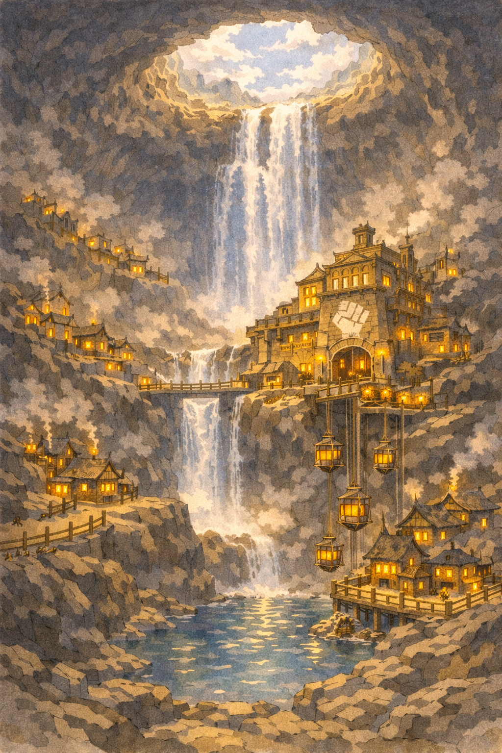 Über ihnen klaffte ein gewaltiger Krater in der Decke, durch den der Himmel sichtbar war. Dunkle, graue und düstere Wolken jagten darüber hinweg – und aus einer Felskluft am oberen Rand stürzte mit gewaltigem Tosen ein gigantischer Wasserfall in die Tiefe. Die Wassermassen zerschlugen auf einer steinernen Plattform in der Tiefe, wirbelten in Gischt und Dampf empor, und verschwanden dann in einem weiteren Schacht, der sich dem Blick entzog. Das Donnern des Wasserfalls vermischte sich mit dem Dröhnen der Maschinen, dem Brüllen der Öfen und dem Rufen der Zwerge zu einem urgewaltigen Klangteppich, der die ganze Halle durchdrang.
