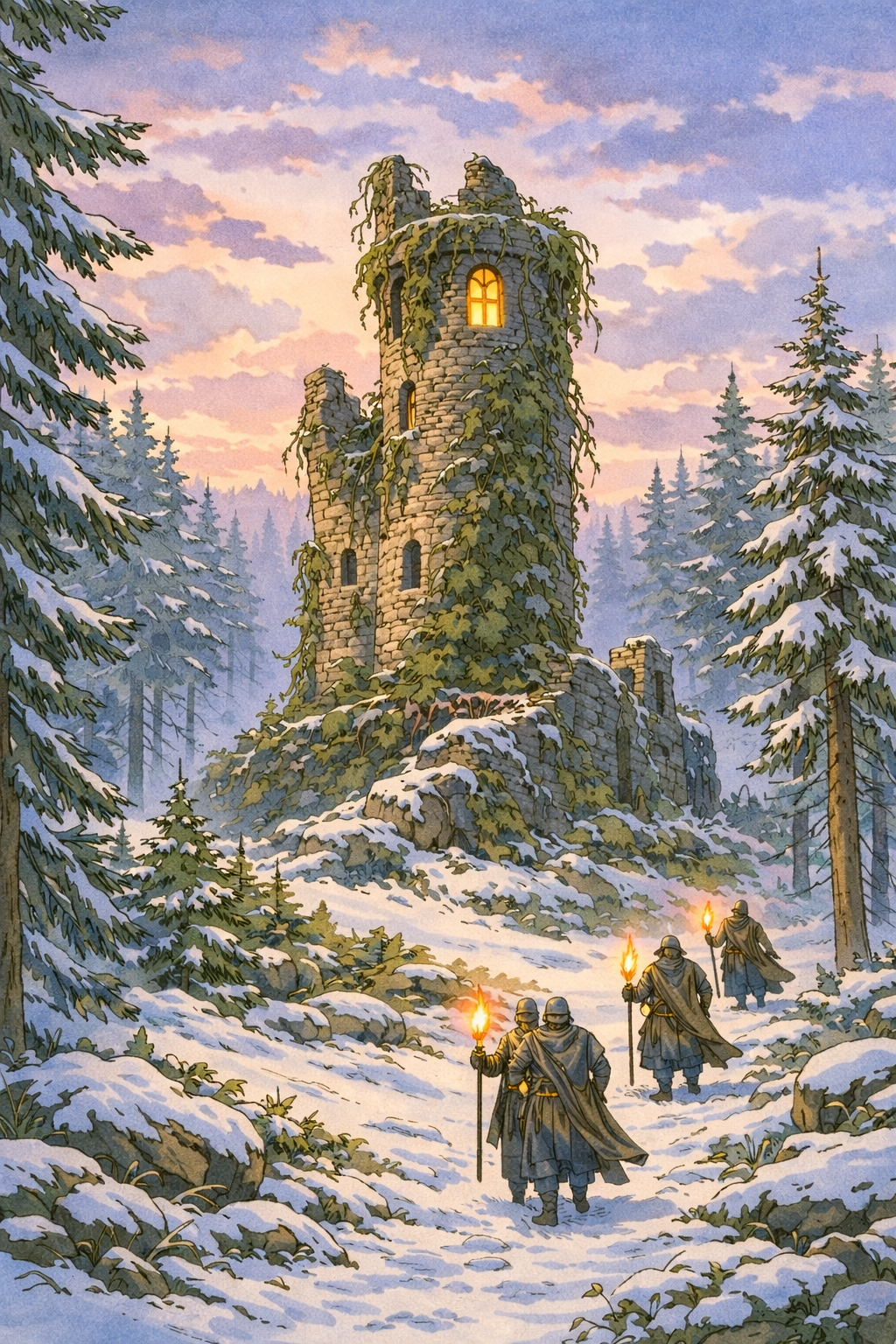 Robar blinzelte, um sich den Schnee aus den Augen zu wischen. Da tauchte vor ihm ein langer, dünner Turm auf – halb zerfallen und zur Hälfte von dunklem Efeu überwuchert. Auch die Räuber hatten den Turm entdeckt. Öklan hielt an und gab den anderen ein Zeichen.