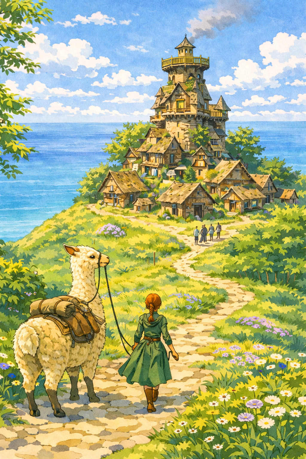 Rose packte die Zügel ihres Dingas und eilte weiter. Schon bald hatte sie die anderen wieder eingeholt, die den grünen Hügel zum Weiler hinaufstiegen, der nun langsam klar erkennbar wurde. In der Mitte stand ein turmartiges Gebäude, das mit zahlreichen kleinen Erkern und schiefen Dächern versehen war. Rundherum gruppierten sich kleinere Häuser wie eine unregelmässige Mauer um den zentralen Bau. Ganz oben, auf einer einfachen hölzernen Plattform ohne Dach, erhob sich ein Wachtturm.